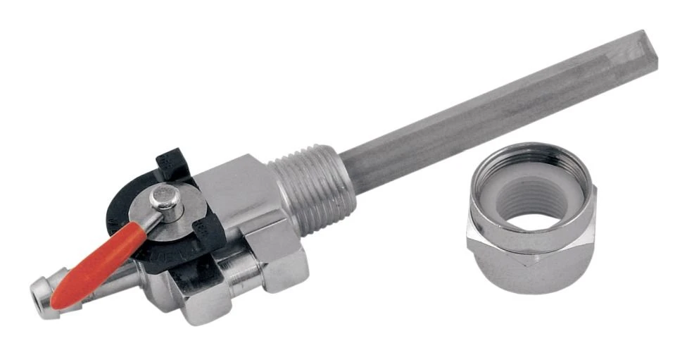 This petcock features on, off and reserve with an easy-to-use knob and 5/16″ barbed fuel outlet and a fine wire-mesh screen. The valve has 3/8″ NPT threads and comes with a 3/8″ NPT to 22mm adapter nut.