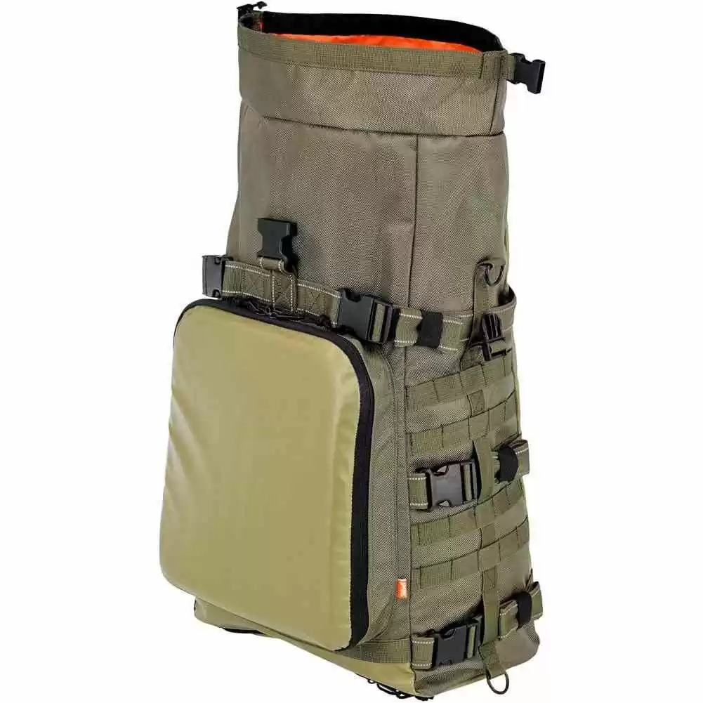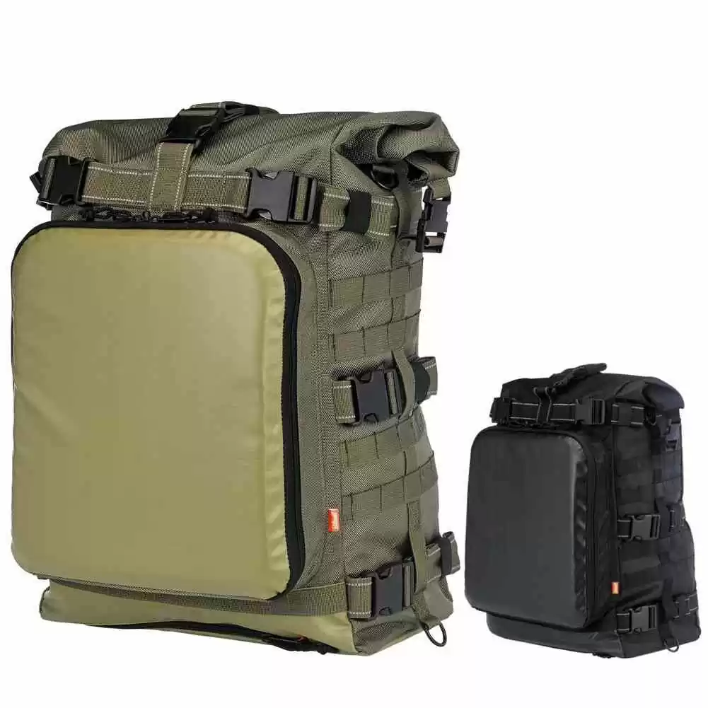 Built to hold all your gear, this robust moto-ruck will easily swallow everything you need to travel and camp from your motorcycle for days on end. Adding functionality, the large external tool compartment is padded on the outside so you can lean back on it. This section easily unzips to put your tools and smaller items right at your fingertips without unstrapping the bag from your bike. The EXFIL-80 UV-treated and water resistant, but when you need 100% waterproofing, just open the zipper just under the tool compartment and pull out the attached waterproof sleeve and slide it over the entire system.