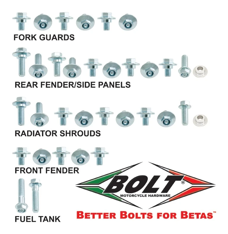 Each Bolt Fastener Upgrade kit is carefully researched and designed to include all fasteners, shoulder bolts and aluminum bushings needed when replacing the fork guards, front & rear fenders, side panels, radiator shrouds and fuel tank. Upgrades older Beta models to the new style shoulder bolt and eliminates the old style Allens and bushings. Kit contents are labeled for exact placement.