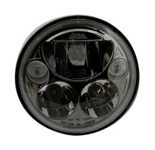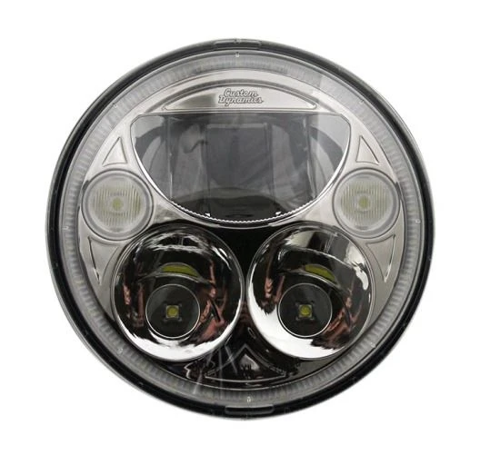 The Custom Dynamics TruBeam headlamp is their premium headlamp designed for motorcycle use. The complex reflector design features 3 low beam LEDs and two bright high beam LEDs. It is constructed with a combination of projector and reflector type LEDs that provide noticeably superior lighting. It is the same size as the stock lamp so there is no additional trim ring needed.