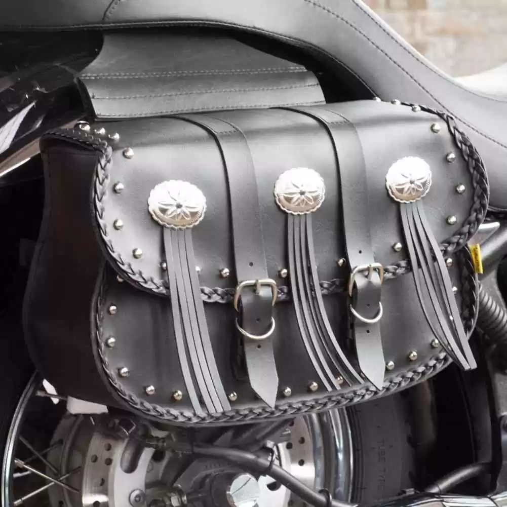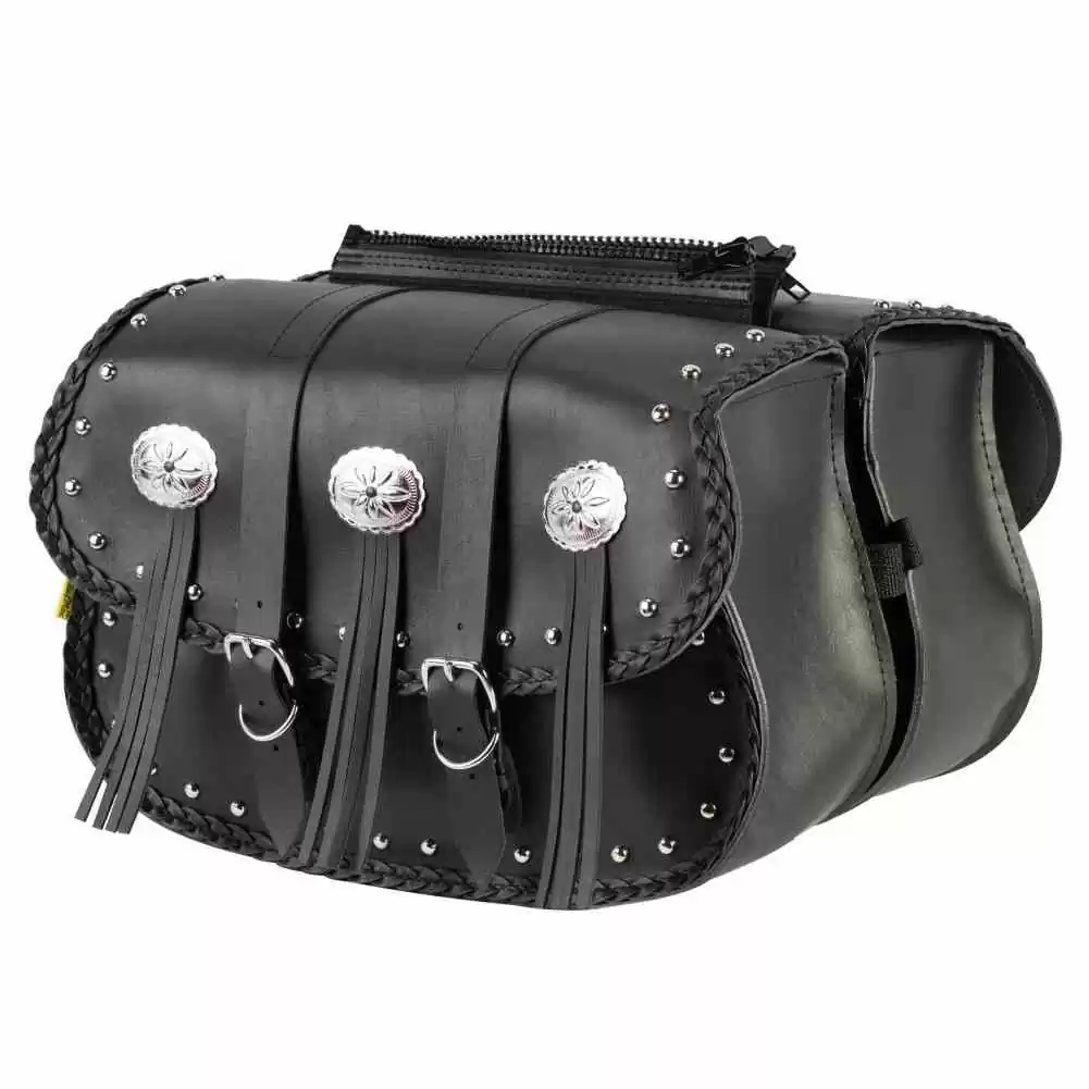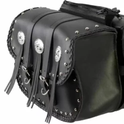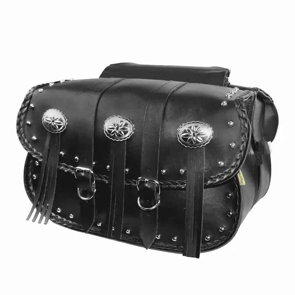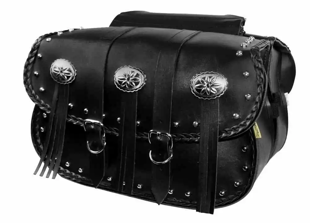 - Features studded and braided design with nickle chrome conchos and fringe.
