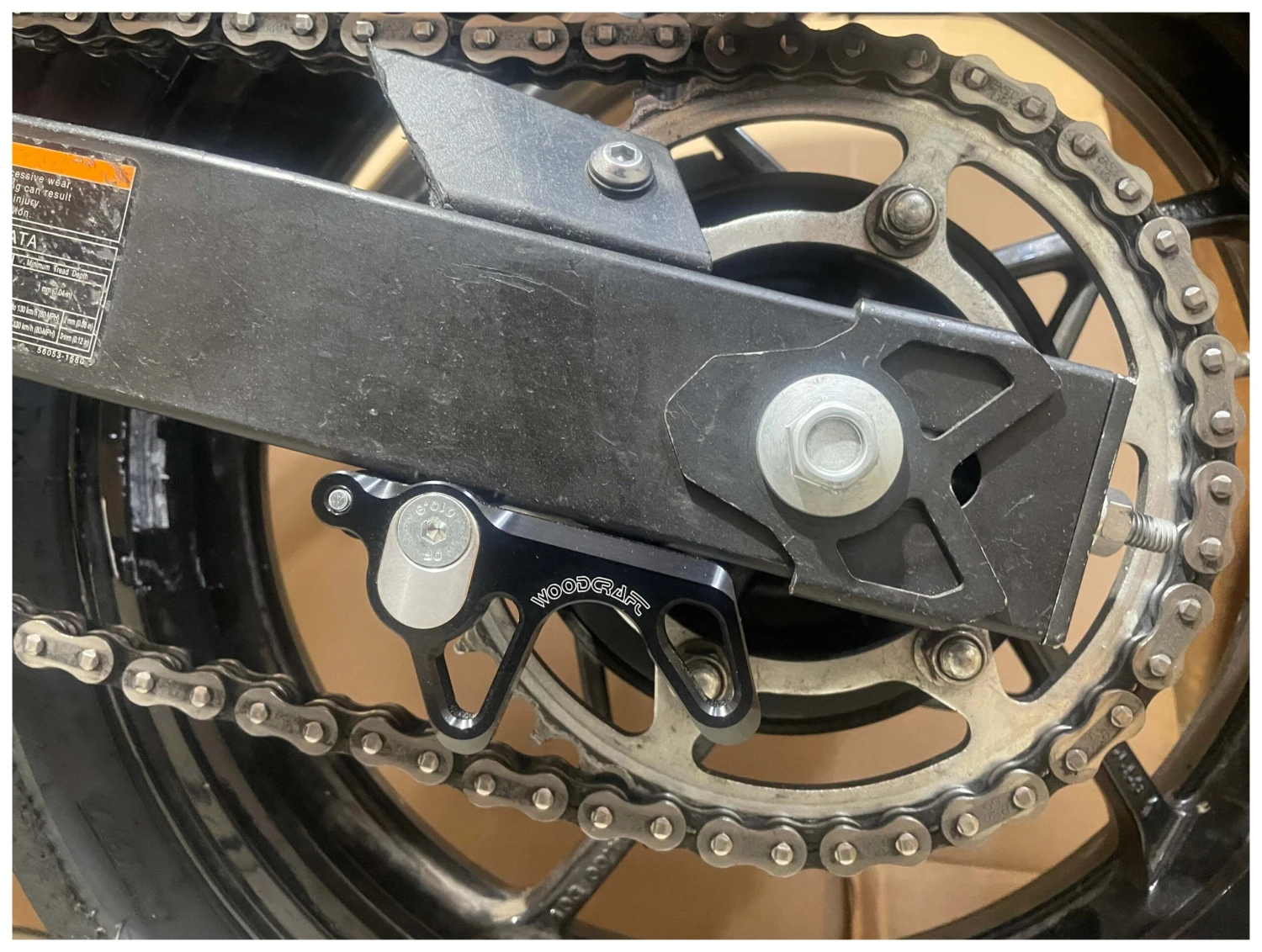 Note: Chain adjuster plates need to be rotated 180° for SBK lifter to contact swingarm. See instructions for further information.